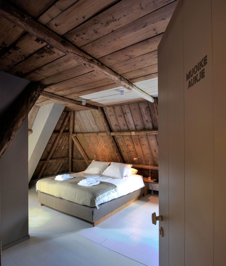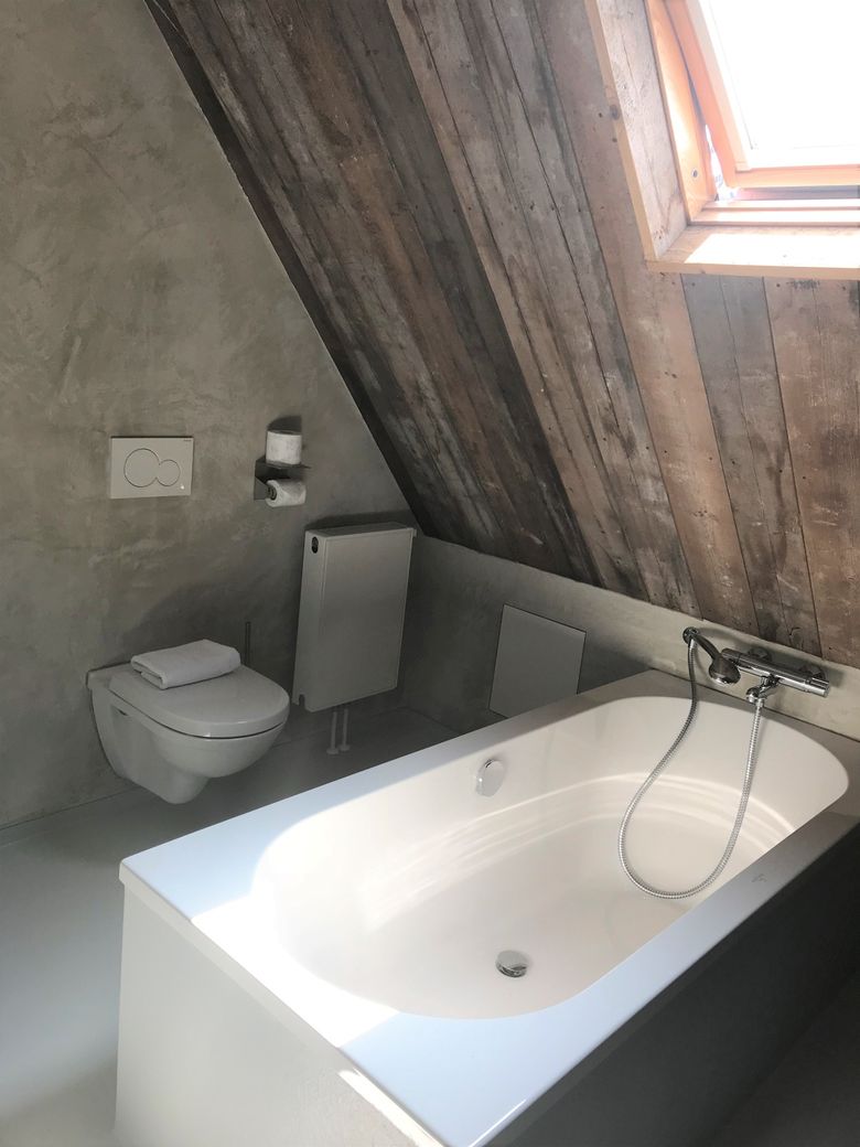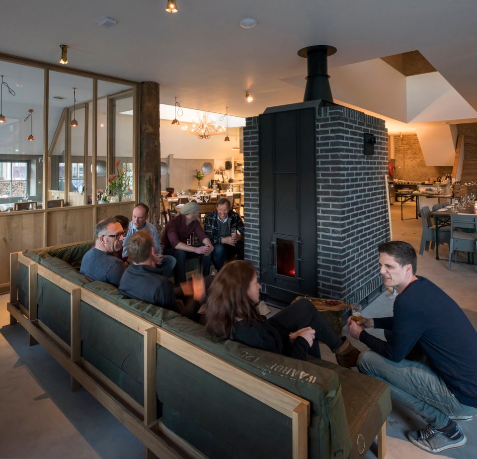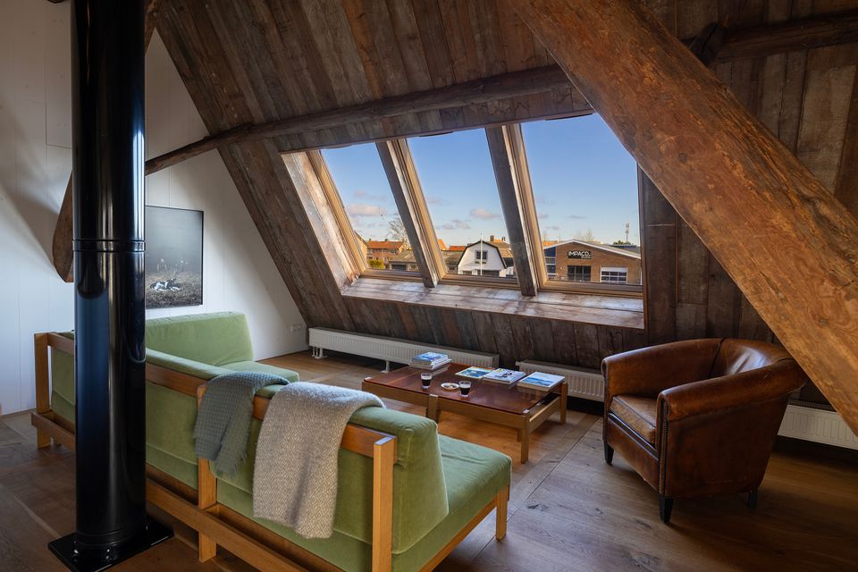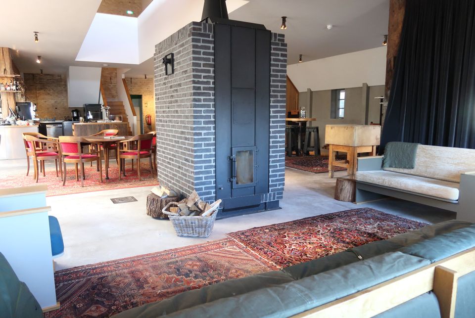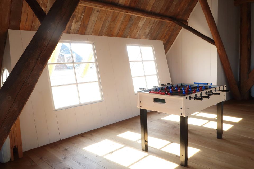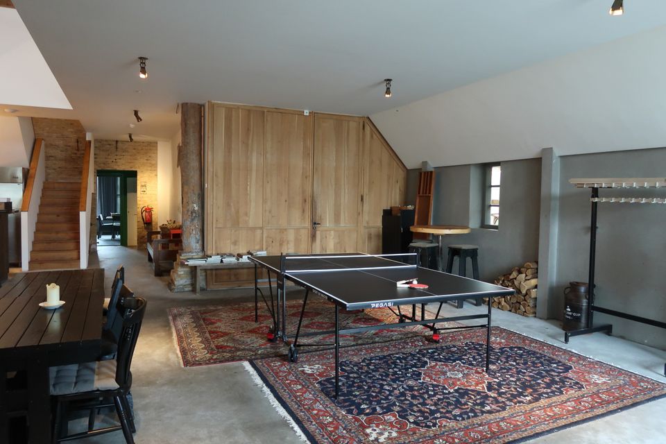 Je komt binnen in een ruime en warme leefruimte, ingericht met meerdere zithoeken, comfortabele loungebanken, een open haard en tv, ideaal voor lange avonden samen. De professionele open keuken is van alle gemakken voorzien voor wie zelf wil koken, maar er is ook de mogelijkheid om een professionele chef in te huren voor een culinaire avond of workshop. Dineren kan met de hele groep, zowel in de leefruimte als in de aparte eetkamer. Voor wie zin heeft in een spelletje is er binnen volop vertier: tafeltennis, tafelvoetbal of gewoon gezellig borrelen bij de haard. Deze plek is geschikt voor ieder seizoen, warm en knus binnen, levendig en licht buiten. Het huis beschikt over zes slaapkamers en vijf badkamers, met ruimte voor maximaal 16 personen. Op de eerste verdieping zijn vijf kamers met tweepersoonsbed en elk een eigen badkamer met douche en toilet; één van deze kamers heeft daarnaast een bad. Twee kamers kunnen worden uitgebreid met een extra bed, ideaal voor gezinnen of vriendengroepen. Op de begane grond bevindt zich een slaapkamer met drie 1-persoonsbedden en een eigen wastafel, met toiletten dichtbij. Alle kamers zijn stijlvol ingericht en ademen dezelfde warme sfeer als de rest van het huis – met comfortabele bedden, rustgevende kleuren en veel daglicht.
